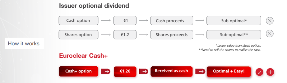 𝗘𝘂𝗿𝗼𝗰𝗹𝗲𝗮𝗿 𝗖𝗮𝘀𝗵+® launched in March 2025 in a partnership between Scorpeo and Euroclear to provide a simple, automated solution through market infrastructure to capture the lost value for investors. Euroclear Cash+ provides investment managers with a 3rd option on scrip dividends to allow them to maximise the value available within optional dividend elections.