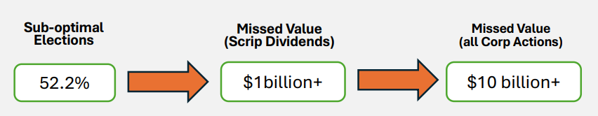 Despite these initiatives and the huge cost of processing voluntary corporate actions, the number of sub-optimal elections and the missed value for investors is increasing.